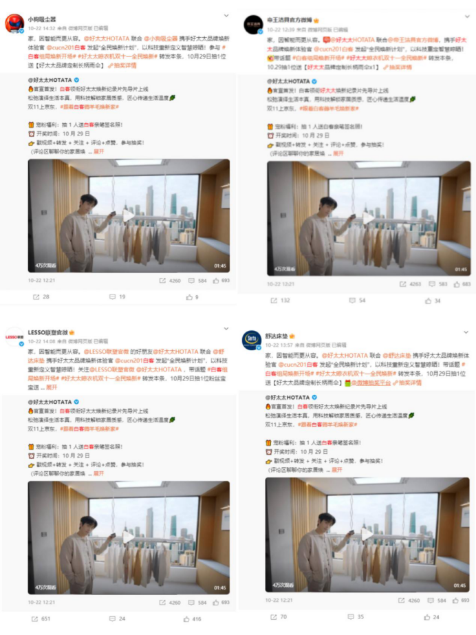 在明星效应的基础上,好太太构建了多层次的内容传播体系,《晾晒焕新家》系列纪录片以真实用户故事引发情感共鸣,让科技成为连接家人情感的纽带,成功实现了品牌价值的深度传递。同时,好太太在抖音平台发起的双11全民换新抖音全民任务吸引了超3000名用户创作投稿,视频总播放量突破2.1亿次;在社交平台上,用户通过#跟着白客薅羊毛焕新家#话题,自发分享家中阳台的焕新故事,成功让本次双11传播从单纯的"品牌声量"转化为"用户心声",引发全平台用户热议。